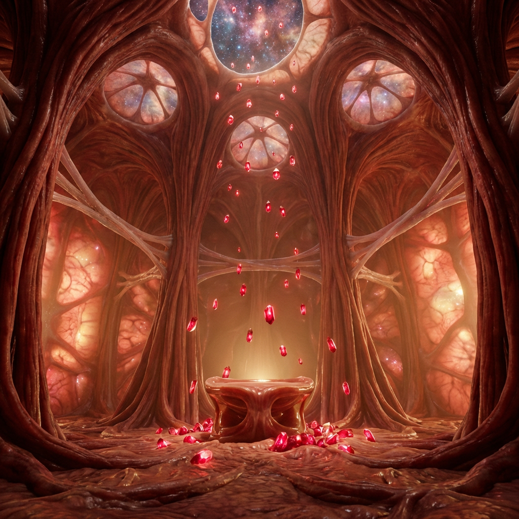 A glut of crimson crystals spill through the glucose transporter, scattering across the stone floor. Sweetness floods the air promising relief and forgetting, if only for a short moment.